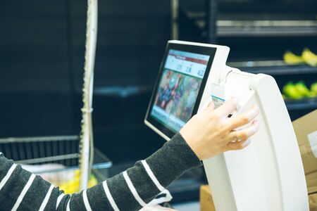 Close-up of a woman's hand using a POS terminal to weigh apples in a supermarket