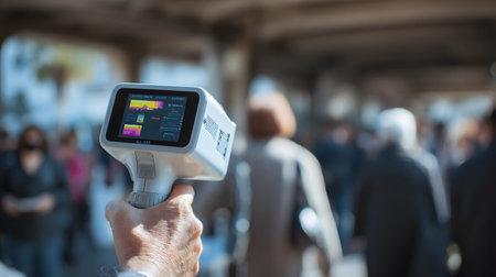 A handheld thermal thermometer scanning crowded public entrance for health screening, urgent preventive check with device