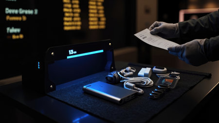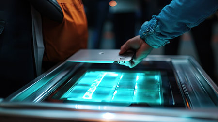 A passenger removing a laptop from their bag at an X-ray machine checkpoint, preparing for screening.