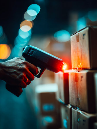 Warehouse employee uses a handheld scanner to check barcodes on stacked boxes during evening shifts in a distribution center.