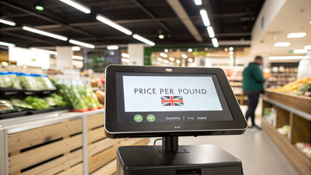 A sleek payment terminal sits on a grocery store countertop, surrounded by vibrant fruits, showcasing the intersection of technology and modern retail experiences.