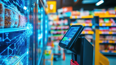 A modern retail environment showcasing a smart checkout system with a digital display, emphasizing an efficient shopping experience in a colorful store aisle.