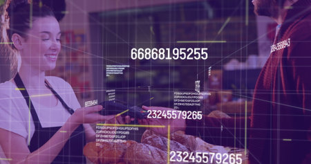 Image of data processing over diverse people paying with credit card. global finances, computing and digital interface concept digitally generated image.