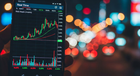 Hands holding a smartphone displaying a stock market app with real-time financial data, highlighting technology in finance.