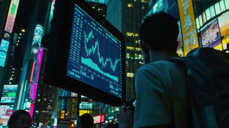 A stock market display showing the general trend of an upward movement, with digital numbers and graphs on glass panels in front of bustling city streets at night. The focus is on people walking past the screen, some looking up to take notes or photograph the graphics. Blue lighting adds depth and contrast against the black shadows. --chaos 30 --ar 16:9 --v 6.1 Job ID: f8cbe862-80d7-4800-98bf-a50488faaf0a