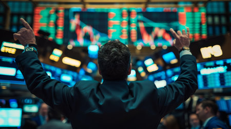 A woman stands victoriously with raised arms in front of a colorful stock exchange board, celebrating success in a bustling financial environment.