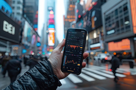 A businessman checks financial charts on a smartphone, with the bustling streets of a cityscape in the background.