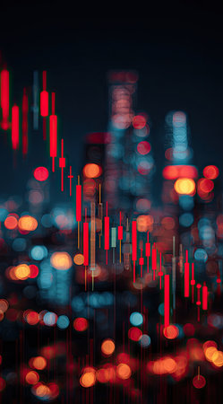 This abstract image showcases a vibrant visualization of stock market trends, illuminated by city lights, blending technology and finance in a modern urban setting.