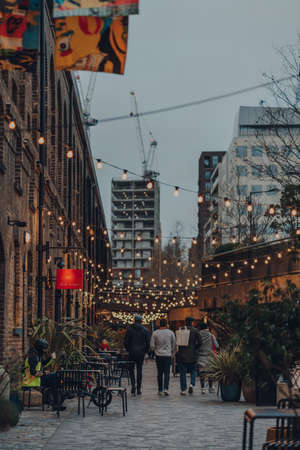 London, UK - January 01, 2022: People walking past the shops in Coal Drops Yard, a shopping destination and foodie hotspot near King's Cross St Pancras stations opened in 2018.