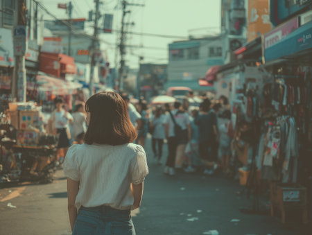 A Korean woman stands and looks into the busy street market filled with shoppers