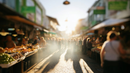 Busy crowded market street during golden hour, capturing the hustle and bustle of a lively marketplace