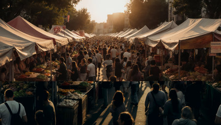 A large crowd of people walks through a busy outdoor street market during a beautiful golden sunset. Rows of vendor stalls with awnings line the bustling pathway.