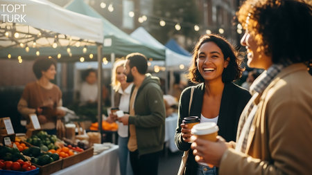 Smiling young woman with cup of coffee at farmers market. Group of people in background.