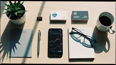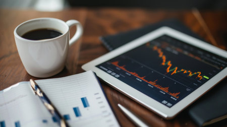 A tablet on a desk with a financial graph showing stock market trends, next to a cup of coffee and notepad.
