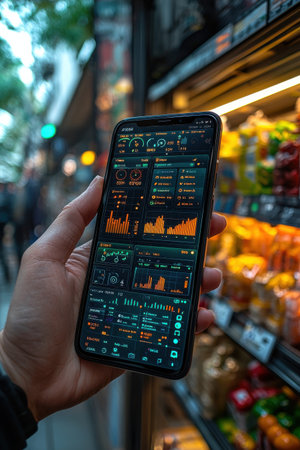 Person Using Smartphone App With Data Analytics Display in Urban Setting