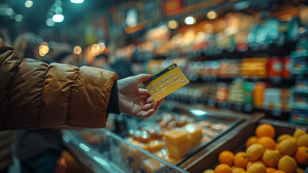 Close-up of man's hand holding credit card in supermarket.