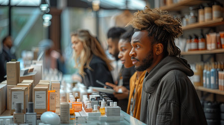 African american man with dreadlocks looking at product display in cosmetics store