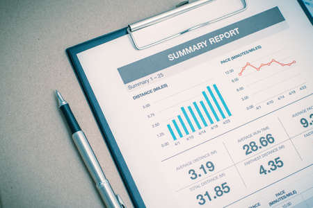 Business report financial statistics documents and infographics at office table closeup / Sales report marketing concept