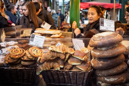 Bakery stall in Borough Market. London (UK). Landscape format.