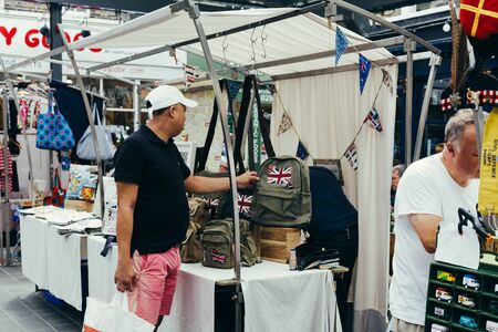 London, UK - July 23, 2018: Man looking at a backpacks on sale at a market stall inside Greenwich Market, one of the oldest markets in London, UK