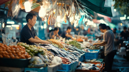 Busy morning market in Bangkok with locals buying fresh produce and fish.