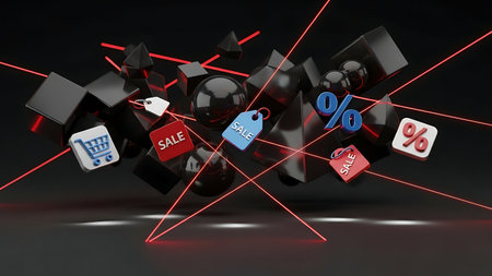 3d illustration of black cubes with percent symbol over black background with red sale sign