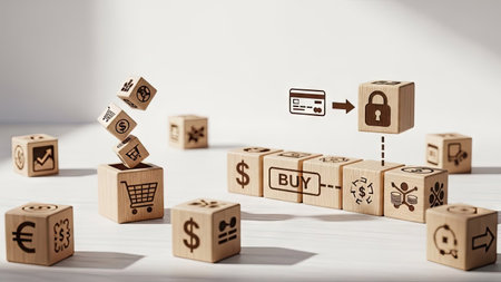 A collection of wooden blocks displays various symbols related to online transactions. The blocks, in warm tones, feature icons such as a shopping cart, dollar signs, and a credit card. The composition uses soft lighting and suggests a clear background, suitable for diverse commercial and editorial purposes.