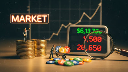 A mechanical gear with a bolt, surrounded by coins and miniature stock charts, illustrating market cycles on a textured background.