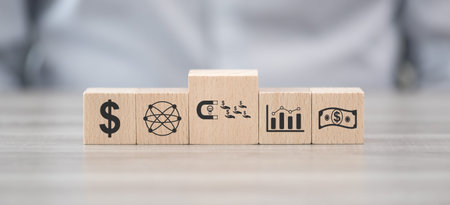 Wooden cubes stacked with business icons and numbers on a bright yellow surface.