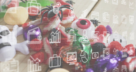 Showing Halloween candy on wood table, with plastic eyes, skull, spider, gummies. Sweets, eyeballs, festive, stilllife, vibrant, doubleexposure