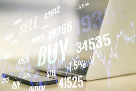 Abstract creative financial graph on modern laptop background, financial and trading concept. Multiexposure