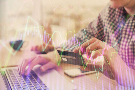 Double exposure of man hands holding a credit card and Forex graph drawing. Stock trading and digital fintech in Internet E-commerce concept.