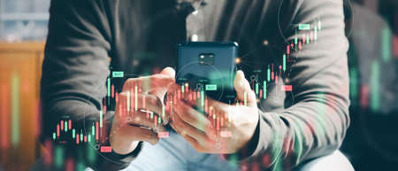 Person investing trading on stock cryptocurrency market using investing application on smartphone. Stock market investment in hand. Trader holding mobile phone looking at candle chart