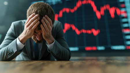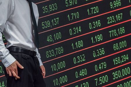 Stockbroker Male Looking at Stock Trading data on Display Board at Stock Exchange Market as Business financial investment concept. The Market trend is decrease or Down as show in red Figure. Stressed business man with hands on head panic wall street