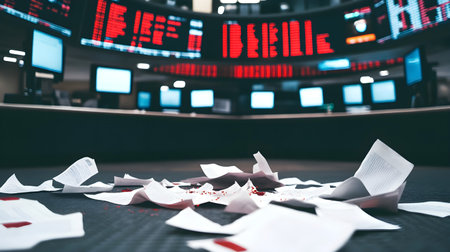 Scattered papers on the floor of a stock exchange with red market data on screens in the background. Recession or crisis in the stock market.