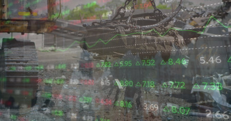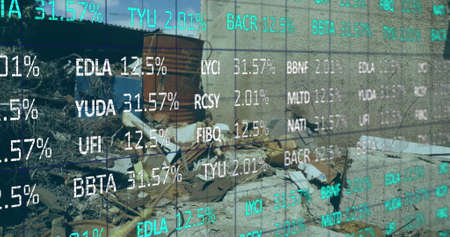 Image of financial data processing statistic recording over urban industrial rubbish disposal site. Global finance business economy environment concept digitally generated image.