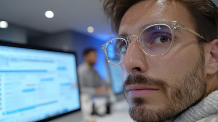 A man with clear glasses looks intently at something off-camera. A blurred figure and large screen displaying text documents are seen in the background, immersed in a modern tech setting