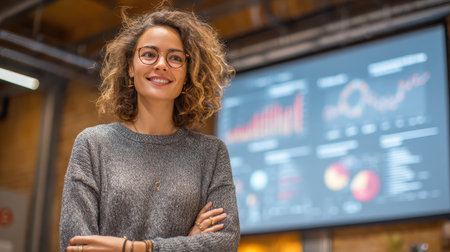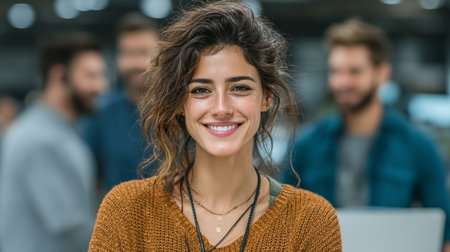 Young professional woman smiling confidently, working with coworkers in a modern office