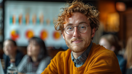 A young man wearing glasses smiles warmly at the camera in a vibrant office setting. Natural light fills the room enhancing the positive atmosphere as colleagues work nearby.