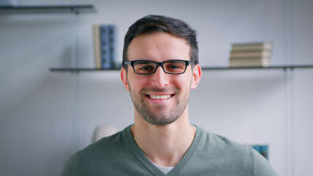 Smiling attractive adult man with glasses looking at camera, view portrait. Attractive adult male with glasses in office