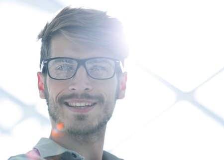 Portrait of a young professional with glasses smiling in a busy open plan office