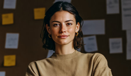 A young woman with short, dark hair smiles at the camera. She stands in a workspace filled with notes and papers on the wall. It is a bright and active environment focused on creativity.