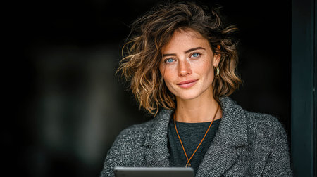 Confident female professional holding a tablet in a modern office environment, radiating leadership and poise.