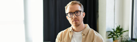 Bearded man in white t shirt looking at camera while standing near window in sunlit loft workplace