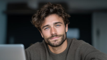 A cheerful young man with tousled hair beams at the camera, exuding confidence and warmth in a stylish office setting. His bright smile and relaxed demeanor create an inviting atmosphere, perfect for showcasing creativity and collaboration in a contemporary work environment.