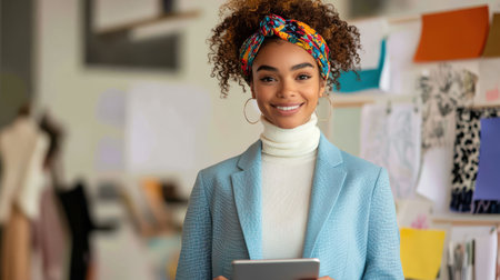 A talented fashion designer stands in a vibrant studio filled with colorful fabric samples and design sketches. She holds a tablet, smiling and engaging in a creative process.