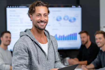 An LGBTQ+ individual giving a presentation to colleagues in a boardroom, confidently explaining points on a projector screen with charts and graphs Generative AI