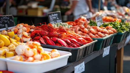 A colorful assortment of fresh seafood including shrimp and lobster displayed at a local market, showcasing the vibrant ingredients for culinary enthusiasts.