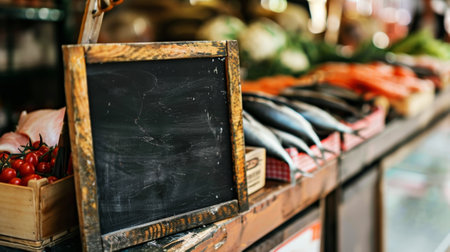 Counter on farmer's market with variety of fresh fish, empty chalkboard for description. Copy space. Generative AI.