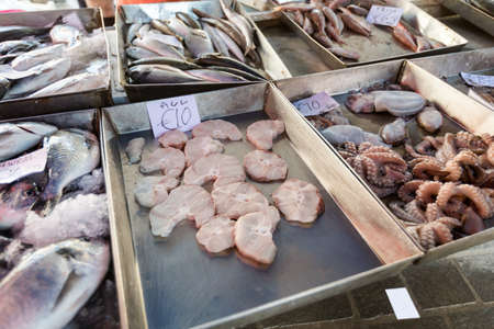 Selection of fresh caught fishes and seafood on Marsaxlokk local market on Malta island. Fresh maltese food ingredients.